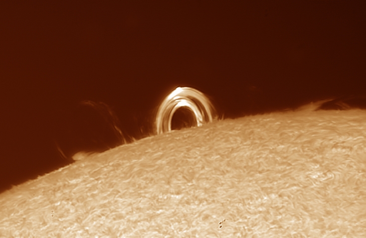 Started as a bright tiny spot on the sun's horizon and grew into a gigantic loop in front of my eyes all within aprox 4 hours. Lunt LS100THA DD on a AP900GTO using a ZWO 174MM Cool camera from my driveway. Incredible experiance watching this in real time.