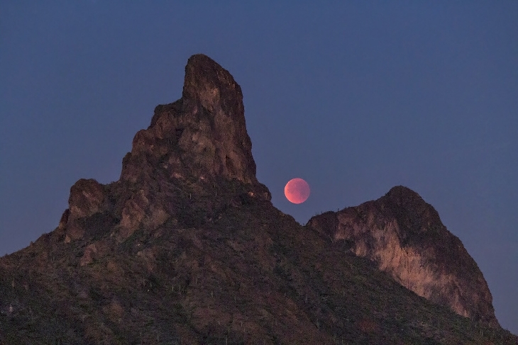 Total lunar eclipse setting behind Picacho Peak north of Tucson, AZ. Canon 80D, 70-300mm lens, f/5.6, 1/4 sec, ISO 3200