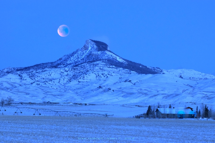 The great serendipity of the total lunar eclipse of January 31, 2018 being a perigee " Supermoon" , a Blue Moon second full Moon of the calendar month , and in the folk vernacular a Blood Moon. As seen from northwest Wyoming it was spectacular--- clear predawn sky after a snowstorm , and the Moon beginning to emerge from totality just above the landscape horizon , just before sunrise.