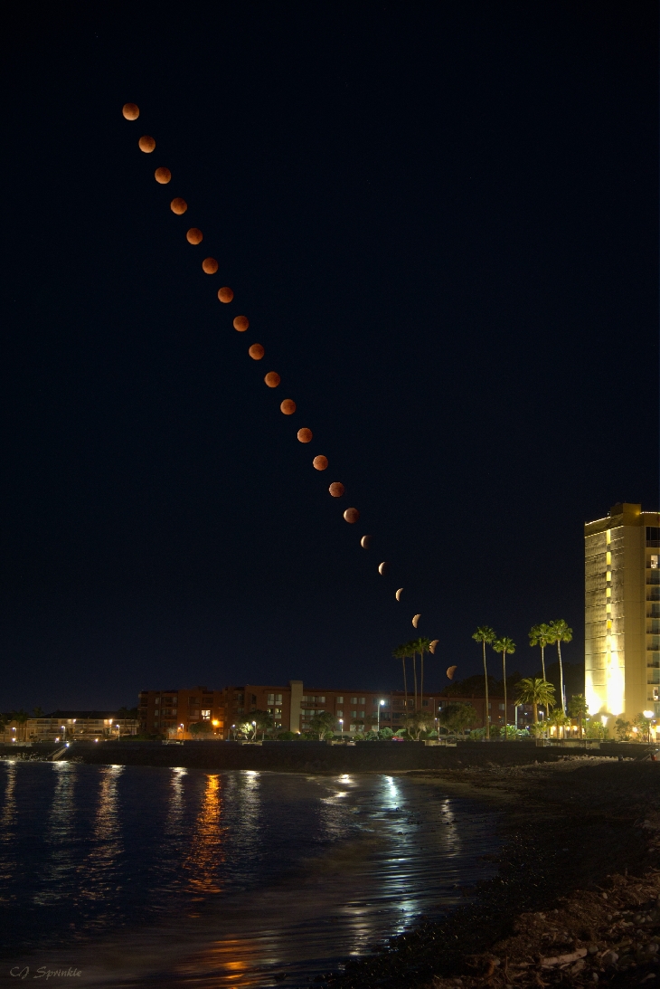 This is a 22-image composition, which encompasses the progression of the total lunar eclipse, as viewed from along the coast of Ventura from about 5am to 6:40am at 5 minute intervals.