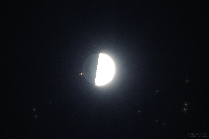 The show was unbelievable! I was able to catch not only the Moon and Aldebaran, but also the Earthshine and some stars of the Hyades star cluster. After the long period of bad weather, the sky cleared up at the day of Moon-Aldebaran meeting and... the clouds reappeared right after the occultation! Clear skies! : )