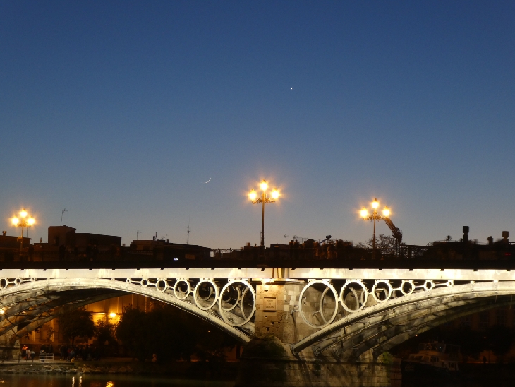 The group of Venus, Mercury and the very young Moon put on a nice show above the Puente de Triana in Seville. In 1519, Magellan started here for the first circumnavigation of the Earth. We used a Lumix TZ-81 at ISO 200 for this quick shot of this magical evening scene.