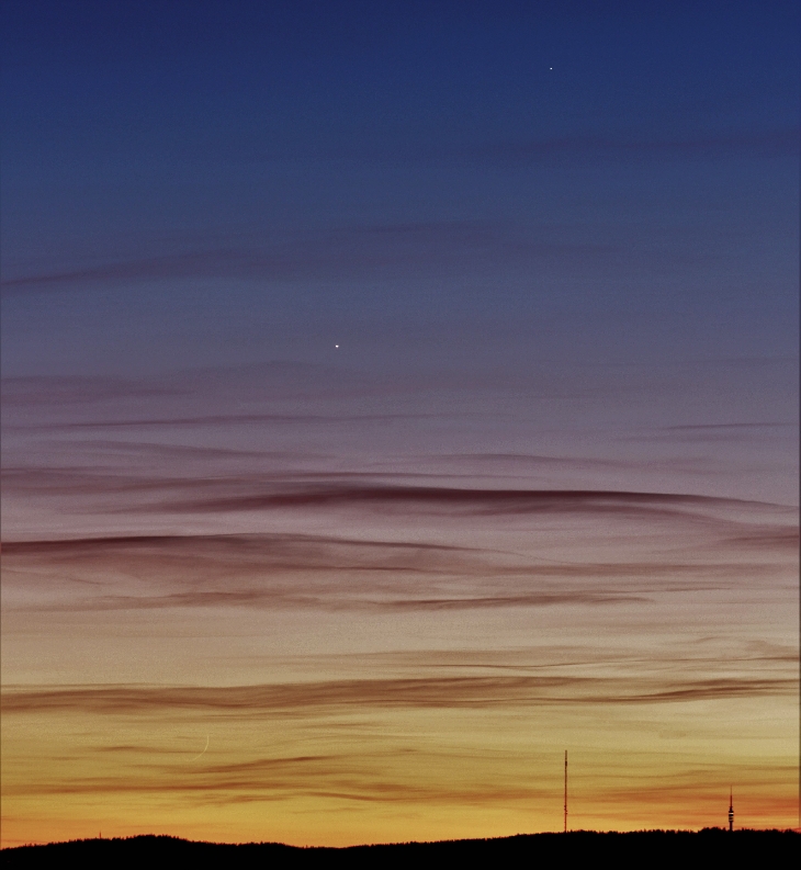 These objects were positively observed on Sunday evening. All objects were visible through 10x42 binoculars. The planets were also clearly seen with the naked eye. A memorable experience. Photo details: Canon EOS 100D, 100-mm lens @ f/4, ISO 200, 1/4 s exposure at 18h16m UT.