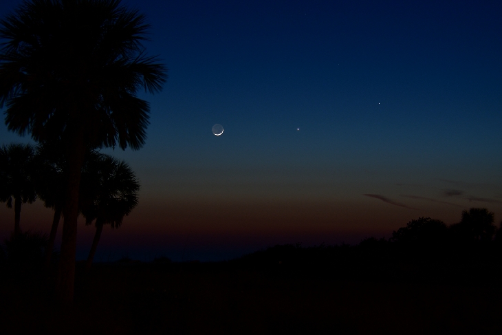 Alongside a palm tree, from left to right, a Waning Crescent moon that is 2.44% full, Venus, and Mercury. Details: Nikon D500, ISO200, 60mm, f/5.6, 4s exposure.