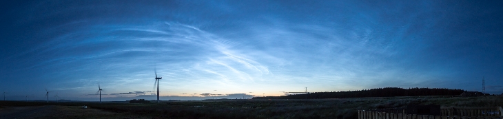 Although my location is too far north (and too light at night) to see aurora, the summer months are an ideal time to enjoy noctilucent cloud displays. The display on the early hours of 19th June was well worth staying up late to see as the delicate details of the NLCs filled the northern part of the sky - stretching from western horizon overhead to the eastern horizon. Approx 180 degree panorama generated from 6 widefield captures (Canon 760D, sigma 10-20mm leans at f/3.5; ISO400 and 0.3 sec)