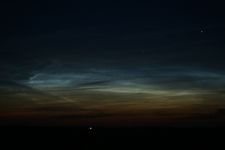 From Edmonton we had a mammoth NLC display on June 24/25. In morning twilight the NLC were overhead! The last picture shows the display well up in the sky with the Sun only about 6 degrees below the horizon.