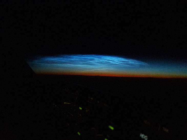 These clouds appeared to our left front before sunrise and were still visible after sunrise behind and to our left. Once the Sun rose they appeared dusty and somewhat beige-brown.