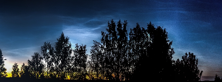 Panorama of noctilucent clouds in summer night. First time for me to document these.