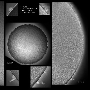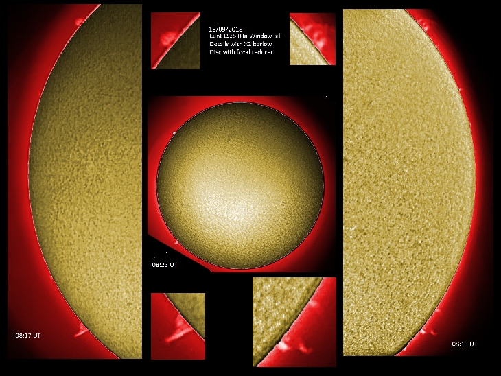 Prominences a bit subdued this morning. Lunt LS35THa + Bresser Mikrokular X2 barlow for details focal reducer for disc Taken from indoors window-sill Each image a stack of a 200 frame avi, processed with Registax 6 and GIMP 2.10
