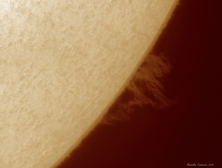 The Sun might be lacking sunspots these days but it makes up for this with a rather large and luminous prominence. Equipment: 150mm F/8 achromat, Quark H-alpha filer, ASI 174MM, Seeing 5-6/10. 1000/10000 frames.
