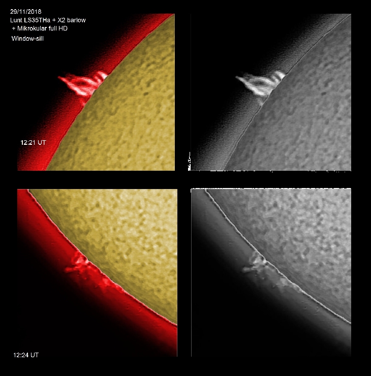Haven't seen the sun for a while, but it did make a brief appearance today. Not much happening, but a couple of pleasing prominences. Lunt LS35THa + Bresser Mikrokular X2 barlow. Taken from indoors window-sill Each image a stack of a 200 frame avi, processed with Registax 6 and GIMP 2.10