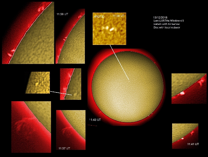 Again, nice prominences today. And a couple of spots in Ha. Lunt LS35THa + Bresser Mikrokular X2 barlow for details focal reducer for disc Taken from indoors window-sill Each image a stack of a 200 frame avi, processed with Registax 6 and GIMP 2.10