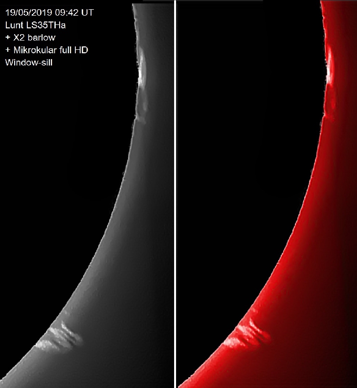 No chance of disc detail today. Just a quick gap in the cloud for the prominences. The upper one is in the vicinity of AR2741 as it disappears.