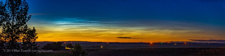 My first display of noctilucent clouds for the season appeared June 4 over Alberta. It seems northern Europe always sees NLCs first every year and as a rule I don't see displays from western Canada until well into June or July. This was the earliest I can recall seeing NLCs from home in Alberta. The clouds were there as it got dark at 11:30 pm and persisted for another hour to 90 minutes before the illumination from the Sun dropped and rendered them invisible low in the north. The set includes a 24mm wide-angle lens shot to show the clouds in context to show their angular extent (note Cassiopeia at upper right) and a panorama that stitches several segments taken with a 135mm telephoto lens.