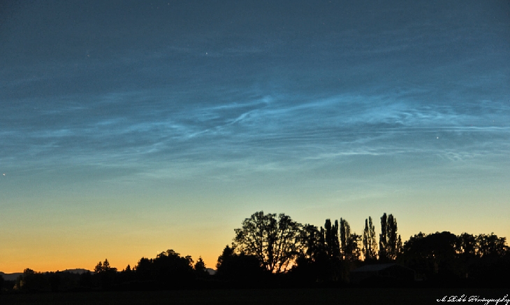 It's been almost 10 years since I've seen NLCs here in oregon and was suprised to see them tonight. At first they were hard to determine if there were just clouds reflecting off of the brightening moon but when I started to really look at them and the fascinating waves and structures I knew they were back. I raced to countryside to really see how vast they were, I expected a patch of NLCs but they stretched the length of the whole horizon, it was impressive but soon the moon light started to win and they faded away before even setting. Hopefully though this is a taste of what is to come in this early NLC season