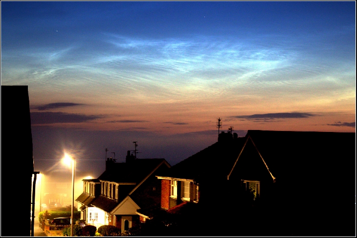 Just after midnight I spotted a faint display of Noctilocent clouds very low in the northern sky, Had a feeling then that better displays where just hours away (before dawn)So I waited and watched the sky from my bedroom window,just before dawn the show began and it was beautiful.Lasted about an hour before a early morning fog bank rolled over the village and ended the display.