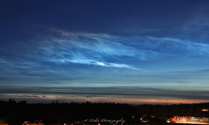 Noctilucent Clouds doesn't describe tongihts display, Noctilucent STORM is more fitting, the brightest and most amazing display I have EVER seen, at 940PM local time they covered ever inch of the night sky, not just west, but to the north, to the east and even to the south, i have NEVER seen them above my head in all directions especially here in Oregon! The structures and waves were incredible, when I would zoom into one spot it looked like you were looking at the ocean instead of the night sky the waves were so intense. Then something strange happened I've never seen before, as they started to disperse before they hit the red of horizon they changed color,the top parts of it almost turned red making it almost look like a rainbow, maybe someone else has seen this before but I haven't seen them enough to noticed this. But WOW what a night