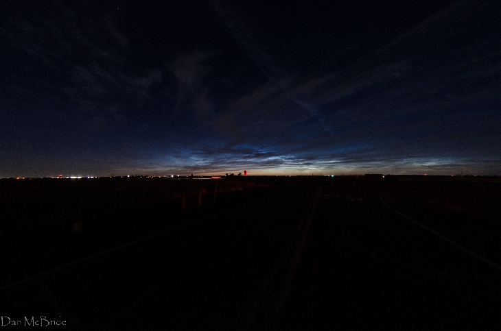 This was my first attempt to see and photograph NLC's. I waited until past 9:00 and nothing. I switched to my 8mm fisheye and the bright blue clouds really appeared. The sky stayed illuminated past 9:45 pm. Image taken at 9:38 pm pst