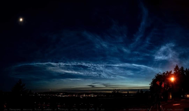 Thanks Deborah. I just submitted my best image that I took through my dedicated digital camera, rather than the first images which were only taken with my Nokia 6.1 cellphone at a Panorama setting. As I mentioned what the observing conditions were like, at the end. I noted that I told others to check NASA's spaceweather, to see the reports coming in, but I didn't know this until I first sighted the Noctilucent Clouds accidentally myself. So I wanted you to understand that I did not see spaceweather to tip me off first, it was just a natural accidental observational sighting that I recognized what the Noctilucent Clouds were right away, ironically from a past experience in July 2009 from the same location, the famous Hilltop Park of Mount Tabor in Portland Oregon. I then asked other people to look up online sites such as NASA spaceweather which confirmed that many sightings were being reported over Oregon and other Northwestern US states. It was really spectacular, as the sky darkened and the clouds began to become brighter. *Also, here's my Noctilucent Cloud Facebook Album link-. https://m.facebook.com/mark.seibold/albums/10157701162137216/ And here's the best image, a 16 frame Panorama photo-stitch. Adjusted modestly in Adobe Creative Cloud Photoshop.