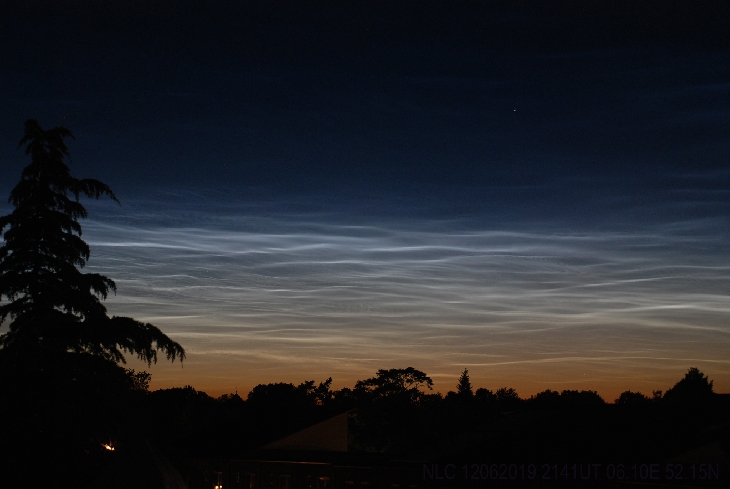 Incredible bright noctilucent clouds after 12 June sunset. The clouds performed different structures such as waves, knots and long bright bands and stripes.