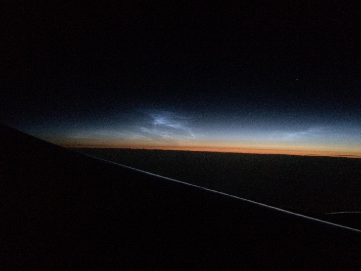 Noctilucent clouds seen from the airplane from Detroit to Amsterdam. South of Greenland was the location of the observation.
