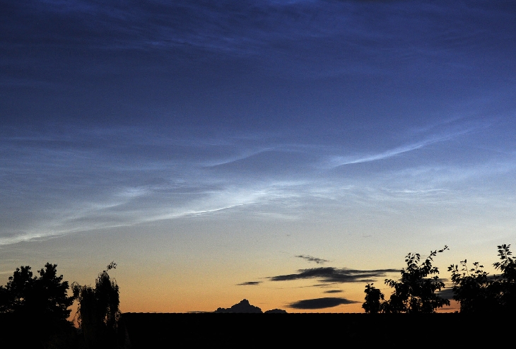 Almost everybody is fast asleep, unaware of the early morning display of the fascinating noctilucent clouds in the sky. Yesterday after sunset there were no visible NLC's, but two hours before sunrise this morning there was a nice display quite high in the sky. Bright star Capella was shining through the NLC's.