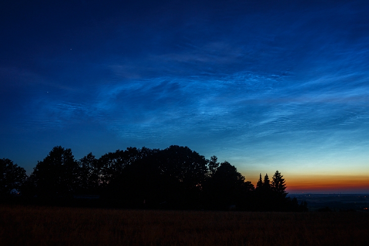 For 21 years ago I have began with the observations of Noctilucent clouds. But on this evening I have never seen before a so stunning display here over Saxony in Germany! I stood with my car on a hill, Landberg, 17 km southwest of Dresden… The evening display stood over 50° above the horizon!!! Many structures waves and lines... I was speechless!! Azimuth: 280° to 40°(!!). What is different this year in the mesopause? More water, extremely cold? Sunspot minimum? Canon EOS 6D, Canon EF 1.8/50 STM, Pentacon 2.8/50