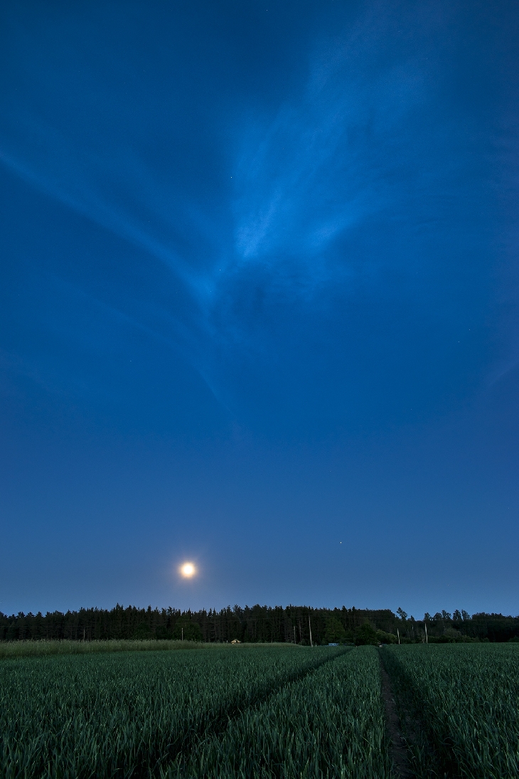 The season has began with a big bang! Nice displays almost every night. Last night we also had a very beautiful NLC display in Estonia. These clouds even stretched far to the south. In this photo you can also see the Moon and Jupiter.