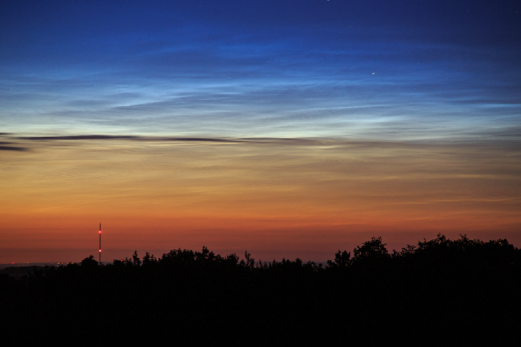 A beautiful NLC display tonight on the day of the total solar eclipse. The transmission tower was the antenna of the medium wave transmitter in Wilsdruff/Saxony at 1044 kHz with 250 kW transmission power. Canon EOS 6D, ISO 320/400, Canon EF 1.8/50 STM, Pentacon 2.8/135