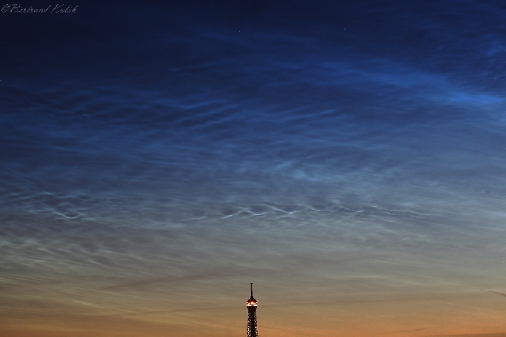 This morning around 4AM some nice noctilucent clouds were visible over the Parisian sky and the Eiffel tower.