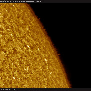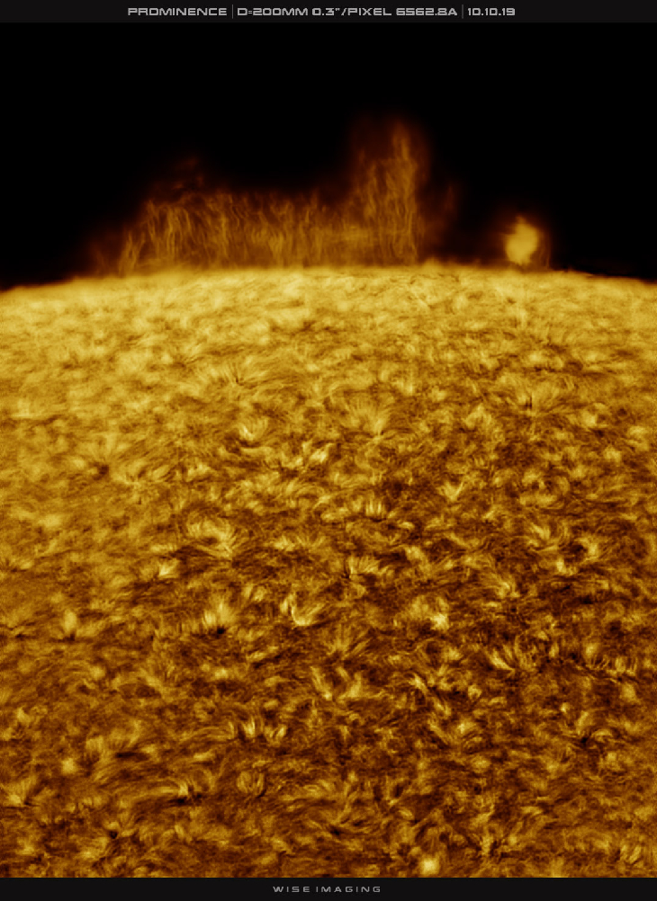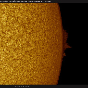Took a look at today's large solar prominence, morphology similar to either a hedgerow or curtain in high resolution (0.3"/pixel image scale) with a 200mm solar scope. Also took a look at spicules at the limb at this scale, always present even during the minimum. Included an Earth Scale with the prominence. And a smaller image scale 0.5"/pixel view of the area.