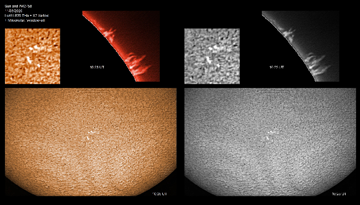 AR2758 and nice prominence today. Ha Sun not quite blank yet! Seeing better, but only very brief holes in the clouds. Benefits of the ever-ready window-sill scope again!