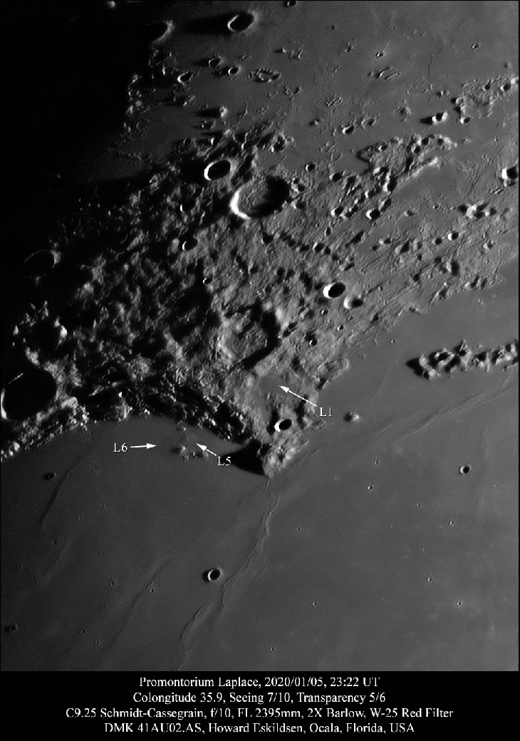 This image shows the location of three domes near Promontorium Laplace. Locations noted per http://sinusiridumdomes.blogspot.com/