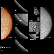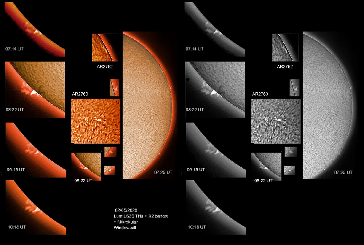 The spots continue to progress, and there was also a decent prominence this morning. In H-alpha, when a prominence is outside the disc it appears bright. When it is in front of the disc it appears as a filament, and is dark. Occasionally, you can see a prominence extending to a filament, something known as a "filaprom". You can see this effect on the 08:22 image. I haven't seen one of these for a while. I followed it for 3 hours or so.