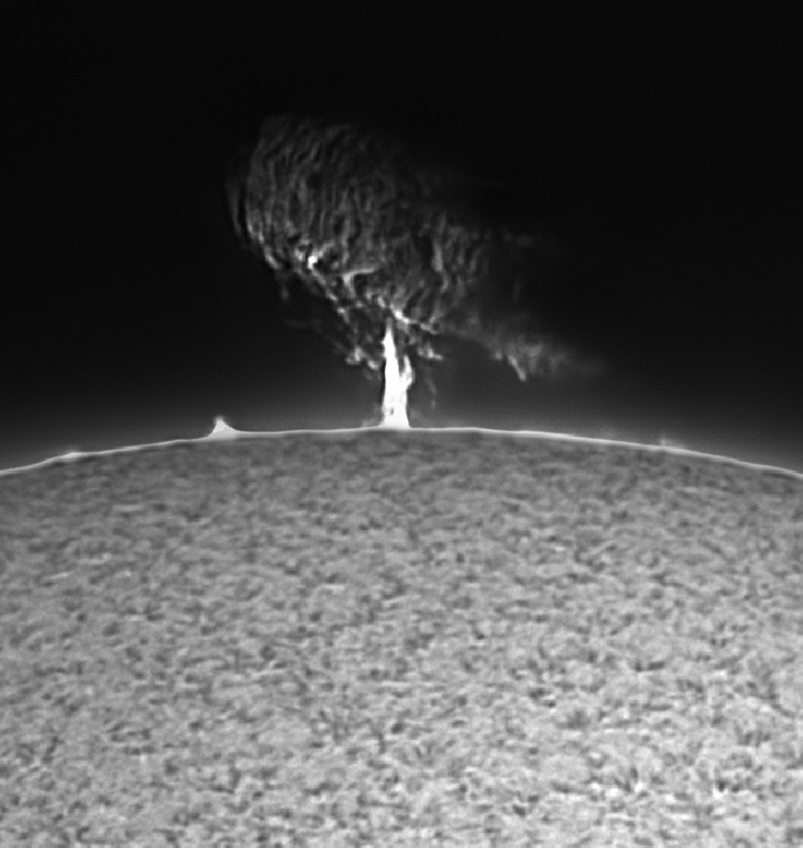 There's a tree on the sun! Despite solar minimum there was a nice 10-earths-tall prominence this morning. Taken with a custom 6" f/8 solar telescope, ASI1600MM camera.