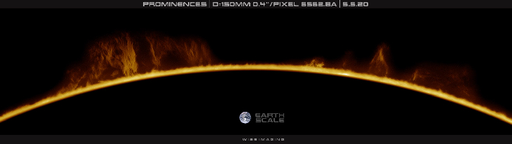 There's a lovely big prominence field on the limb today, some large filaments that finally made it to the limb and spanning a huge amount of area. Captured as a mosaic with a 150mm solar scope in HA. Earth scale provided.