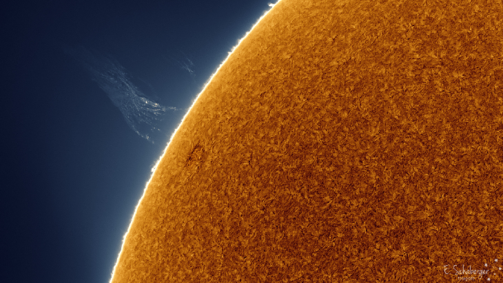 Yesterday, May 18,at 12:07 p.m. (UT) I captured this massive solar prominence hovering over a small, magnetically active region from my backyard in Rafaela, Santa Fe province, Argentina. This huge, but faint, prominence has a height of approximately nine Earth planets.