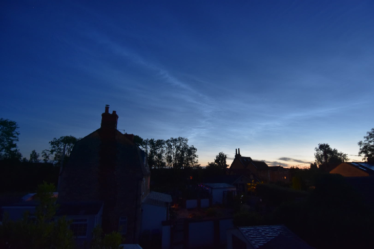 With a full Moon low down to the south I went to view the northern skies, 3:35BST. A large section of electric blue cloud spread 100 degrees around and up to 50 degrees high. I suspect the Moon was assisting, but they faded by 4am.