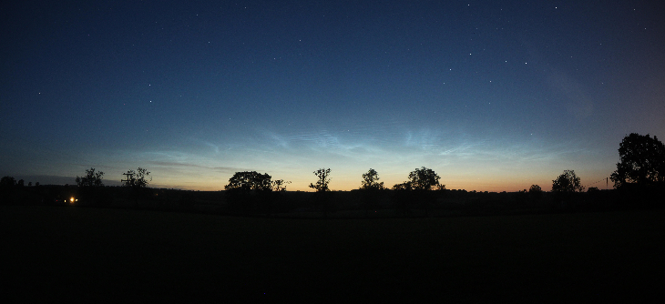 Noctilucent Clouds Great display of noctilucent clouds this morning in the Northern sky between 02:00 - 04:00 BST (01:00 - 03:00 UT). Shared the spectacle with bats zooming above my head and the dawn chorus of birdsong. Two five image panoramas stitched with Microsoft ICE. Canon 1300D, Samyang F2.8 14mm (effective focal length 23mm) F4, ISO 800