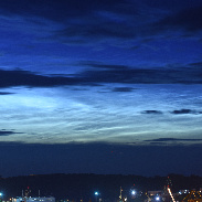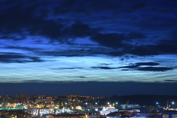 Very bright Noctilucents easily visible above the city and harbor lights.