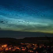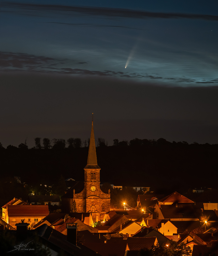 Comet C/2020 F3 (NEOWISE) and bright Noctilucent Clouds (July 8, 2020) just above the church of the village Spicheren.