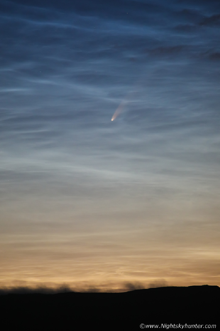 2nd night in a row observing C/2020 F3 NEOWISE, what a show!. The comet was visible to the naked eye as a golden visitor with tail two degrees long and this was embedded within NLCs. The view both with the unaided and eye and in the telescope was out of this world. In the low power eyepiece I observed a yellow-gold coma and tail with streamers, hoods and even 2-3 jets from the central condensation, while this was happening NLC bands and waves moved across the comet's tail in real time, I have never seen a sight like it in my life! there are DSLR stills on a static tripod with 100mm-400mm lens.