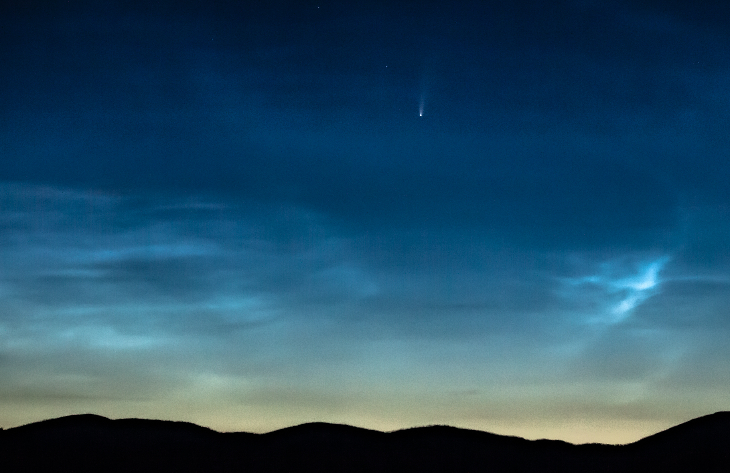 I've been looking for noctilucent clouds all summer but always seem to just miss them. This morning was the third morning I got up to see Comet NEOWISE, and there were a few noctilucent clouds along the eastern horizon as well! Comet viewing deteriorated as it got lighter, and was difficult by one hour before sunrise.My best photos were an hour and a half before sunrise, but I would have gotten up earlier if I knew the comet was already up as high as it was. Canon 5D Mark II, 75-300mm lens @75mm, f5.6, ISO 320, 2.5 seconds.