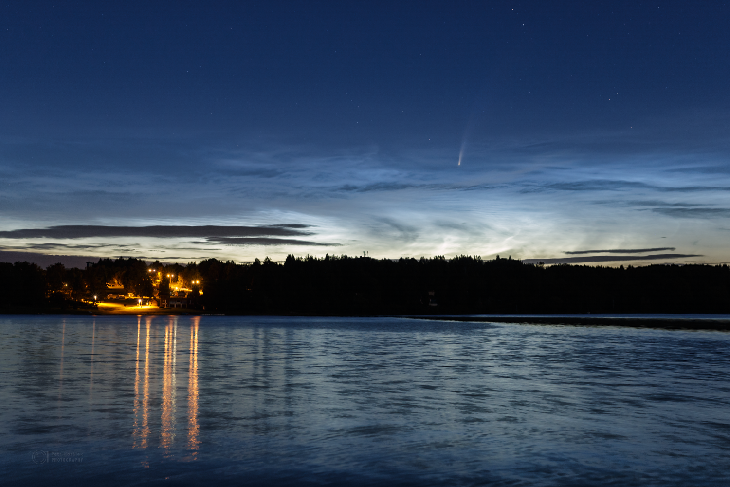 Thousand times same, but still different. NEOWISE rose over Seč lake in the morning of July 10th together with very bright NLCs--again. Well, last time it was epic, but now it is... I am speachless. Thanks to higher position of the comet (and darker sky sooner before dawn) the tail is almost twice longer to naked eyes than 4 days ago. And the display is just splendid. Used Canon 6D, Sigma 50mm, ISO 800, f2.5, 2s exposure.
