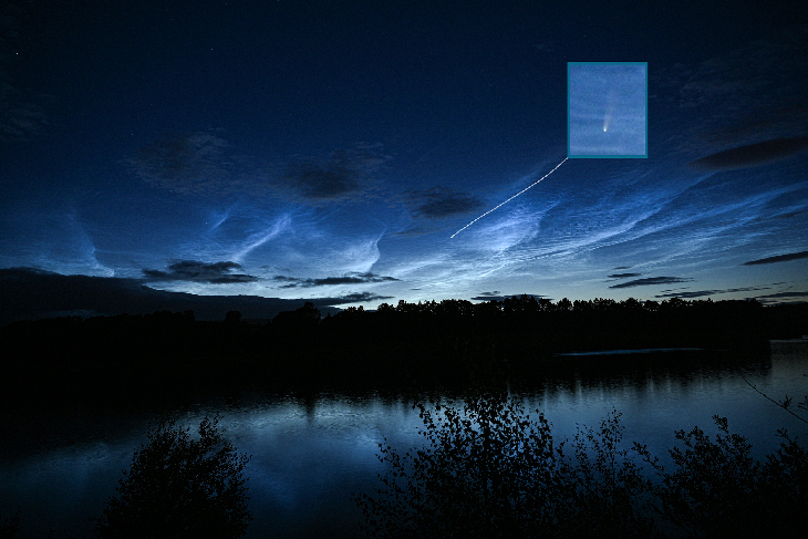 Comet NEOWISE almost lost in the bright display of Noctilucent cloud.
