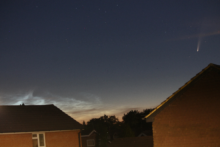 Noctilucent cloud and Comet C/2020 F3 NEOWISE seen from the south of England. Photos at 0142, 0202, 0211 and 0219 UTC, 11 July 2020.