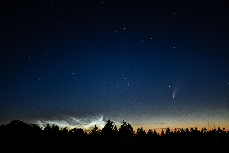 We were just packing up after an incredible night watching Comet NEOWISE when thin tendrils of noctilucent clouds started to cloud on the horizon. An unforgettable night! The comet surprised me with its brightness, nucleus and tail clearly visible to the naked eye as it rose higher into the sky.