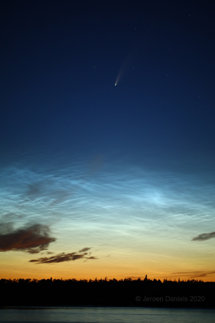Half hour after sunset (10:20pm MDT) we noticed NLC's appearing just under where NEOwise would be. Tens minutes later we finally were able to see the comet with our naked eyes. The combination of the two made for a perfect photo opportunity! 100mm f/2.8 3.2s iso800