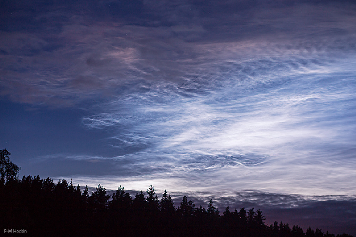 My 17 years old son out with friends send me the message "Noctilucent"! I looked out and didn´t really understand what I saw above the treeline, the NLCs where darker och more red than I´m used to see. Took the car for a quick ride to be able to get a clear horizon. Then I also saw very dark areas beside the bright silver/blue NLCs and higher up these reddish clouds. Amazing sight!