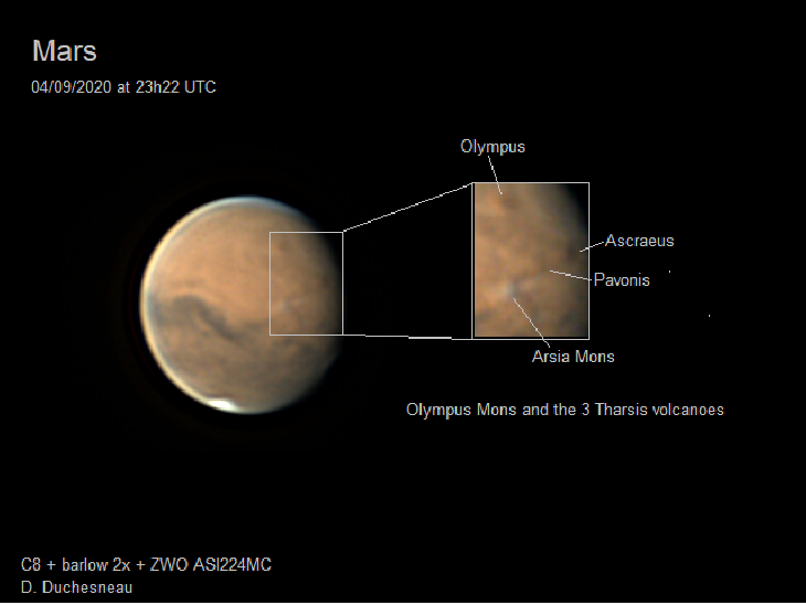 In the image the various topological structures of the planet are quite visible with the northern paler plains , the southern highlands (darker) and one of the volcanic region with Olympus Mons and the Tharsis region with its 3 massive volcanoes: Ascraeus, Pavoris and Arsia Mons.